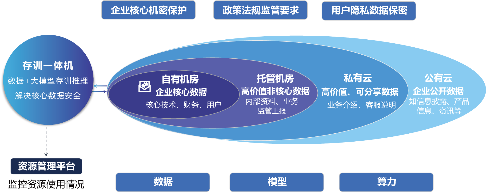 Ezpay金融大模型一体化服务平台给予“算力+数据+模型”三位一体的私有化部署和服务,保障客户核心数据、软硬件均在客户自有机房工作运转。