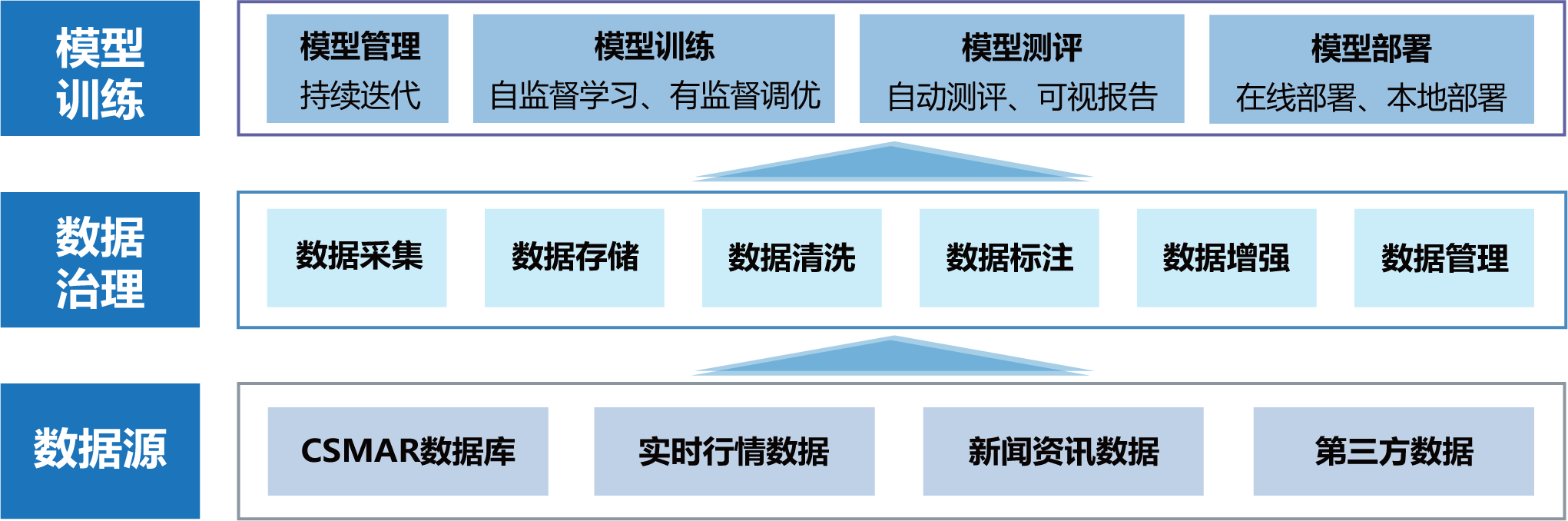 Ezpay金融大模型一体化服务平台给予从数据获取、数据处理、大模型训练、模型测评及部署的全链路服务,降低企业开发“业务场景AI应用”时,治理数据、构建专有大模型的技术和经验门槛。