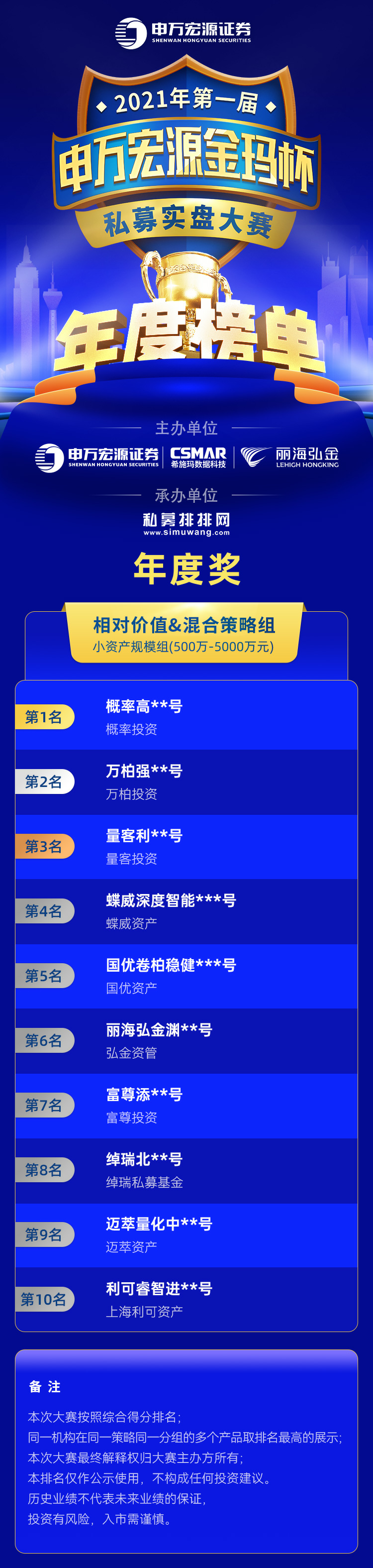 本次大赛的年度奖项、特色奖项是根据大赛公示的定量和定性规则,按照综合得分进行排名,该排名主要是对管理人在大赛期间内的表现进行展示,不代表本公司对私募管理人和私募产品的推介。