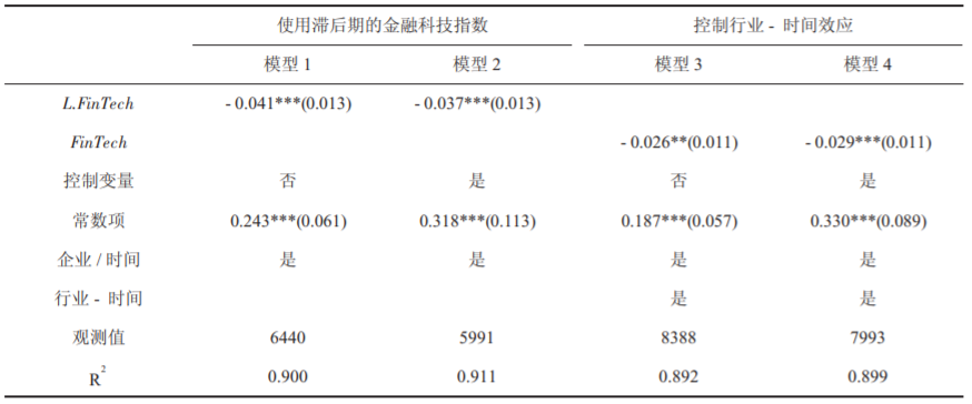 为了保障研究结果的稳健性,文章进行了稳健性分析,方法包括更换金融科技指数的衡量方式(改用地区数字金融覆盖广度、数字金融使用深度以及普惠金融数字化程度等三个指数衡量)、使用滞后一期的金融科技指数进行回归、控制行业-时间固定效应。结果如表5所示。稳健性分析的结果均显示,金融科技显著抑制了企业的“脱实向虚”,与主回归结果一致,证明文章的研究结论是稳健的。