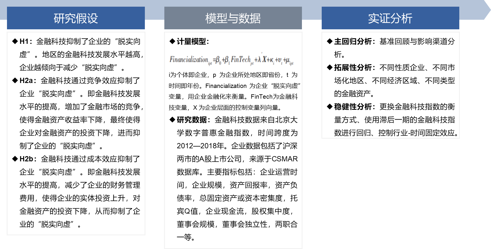 第一时间,针对文章的研究问题,即“金融科技对企业‘脱实向虚’的影响”,作者提出了两方面的研究假设。一方面是针对金融科技对企业投资行为整体影响的假设。企业投资行为既包括对实体经济的投资,也包括对金融资产的投资。因此,金融科技也可以对企业的“脱实向虚”行为产生重要影响。已有研究指出了金融科技对企业投资行为的多维度影响:金融科技技术能够有效解决金融市场的信息不对称问题,增加金融组织对企业的贷款,进而为企业对实体经济投资给予强有力的资金支持;企业对金融科技手段的使用可以影响其风险承担能力,促进企业对实体经济的投资效率;金融科技的开展可以扩大银行信贷、缓解企业的融资约束使企业有足够的资金去投资实体经济。基于上述机理分析,文章提出假设H1:金融科技抑制了企业的“脱实向虚”。地区的金融科技开展水平越高,企业越倾向于减少“脱实向虚”。