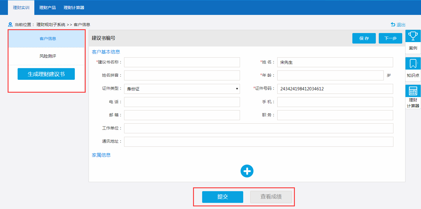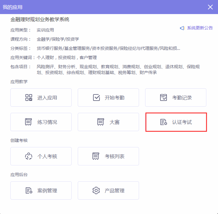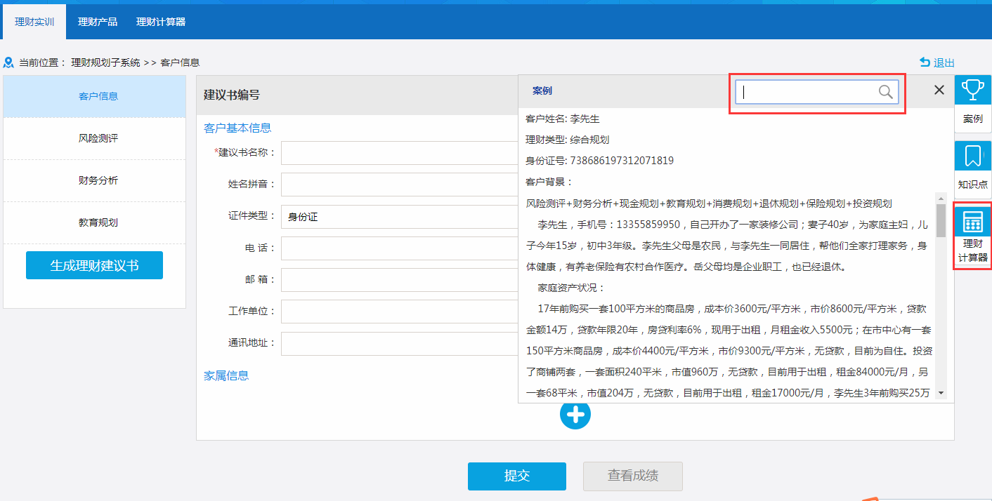 金融理财规划业务教学系统是一款面向院校个人(家庭)理财规划实训软件, 系统包含客户信息录入、风险测评、财务分析、现金规划、教育规划、消费规划、创业规划、退休规划、保险规划、投资规划、税务筹划、财产分配、财产传承、理财建议书生成、理财计算器、投组追踪等内容,让学生全面体验真实工作竞技氛围,深入理解理财规划业务。本次直播主要介绍该实训软件近期优化升级内容,主要包括新增期货产品以及“认证考试“模块,优化实训项目流程,提升用户使用体验。