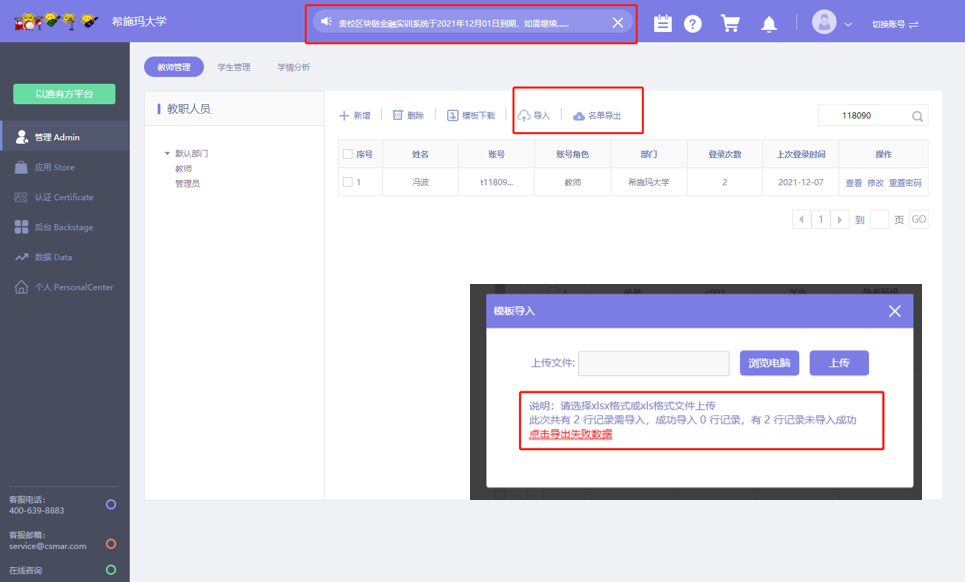 2.用户管理新增导出用户名单、登录次数统计等,优化了关于学生名单进行导入的用户体验等。