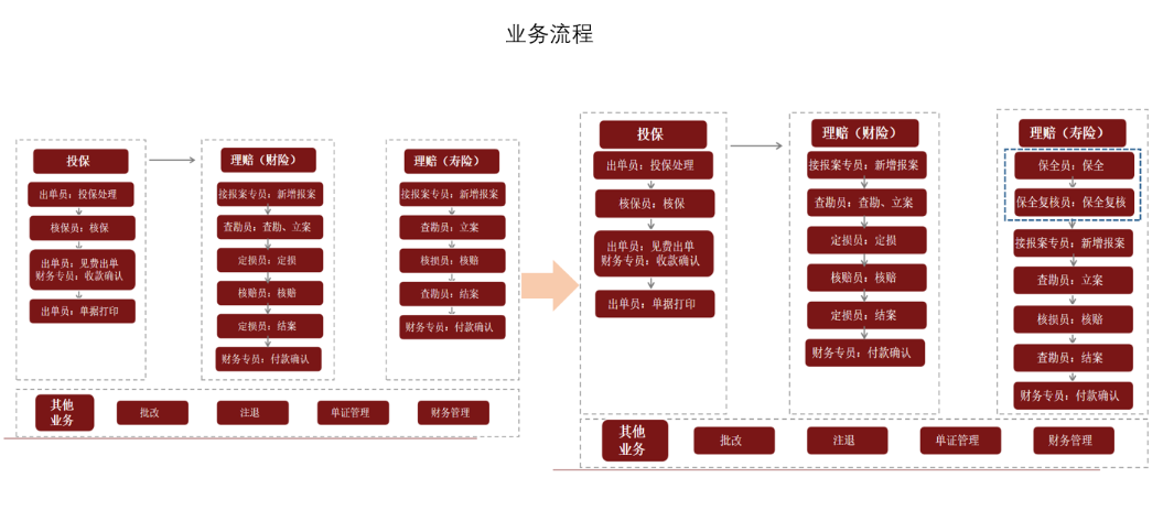 系统包含财寿险的二十一个险种,包括业务员、出单员、核保员、接报案专员、查勘员、定损员、核赔员等九大角色,实现展业、承保、理赔全流程操作。