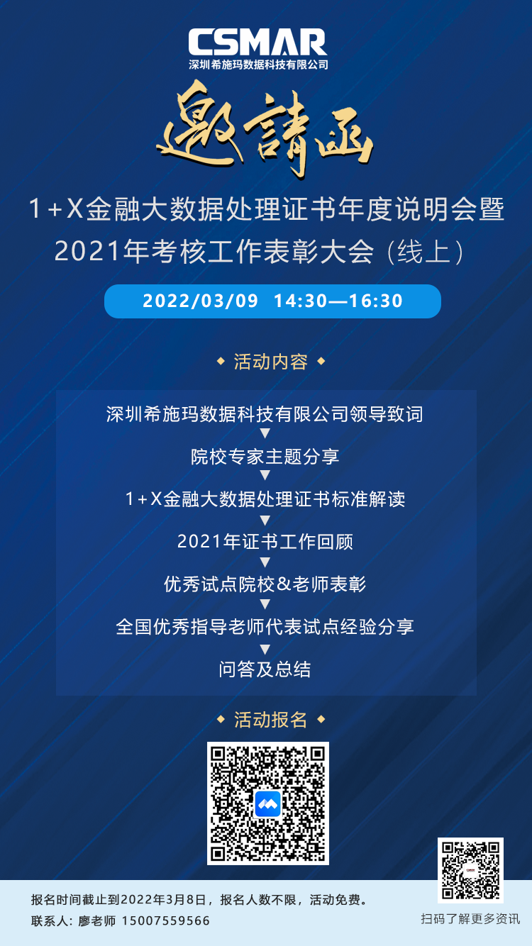 为深入贯彻落实《国家职业教育改革实施方案》和教育部办公厅等三部门《关于推进 1+X 证书制度试点工作的指导意见》等有关文件精神,扎实推进1+X金融大数据处理证书制度试点工作,深圳Ezpay数据科技有限公司(下称深圳Ezpay)将于2022年3月9日下午2:30-4:30举办“2022年1+X金融大数据处理证书年度说明会暨2021年考核工作表彰大会”。